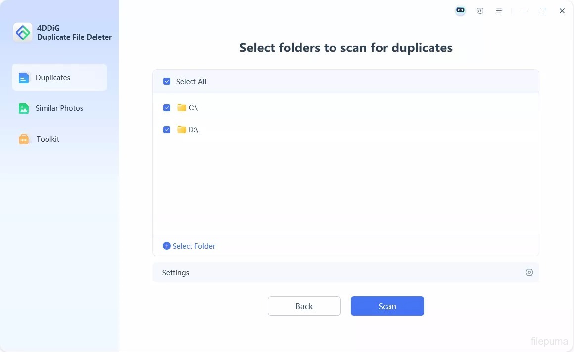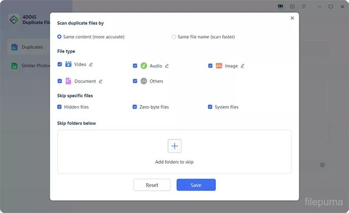 4DDiG Duplicate File Deleter supports a wide range of file types, including photos, videos, documents, and music. It also allows users to set custom filters, making it simple to target specific folders or exclude certain locations. This flexibility helps users carry out a tidy and efficient cleanup.