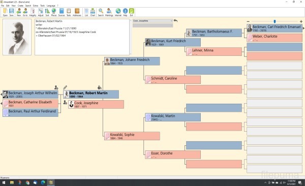 Ahnenblatt Portable supports detailed personal profiles, including names, dates, places, occupations, and notes. Relationships such as marriages, siblings, and children can be displayed visually, making complex family connections easier to understand. Charts and lists help users explore generations and identify patterns within their family history.