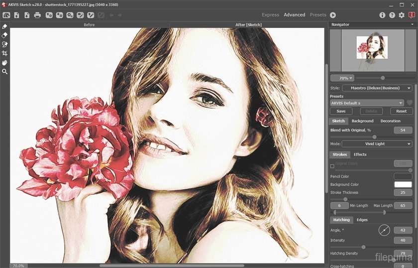 AKVIS Sketch features a wide range of customization options, giving users full control over the artistic output. Parameters such as stroke thickness, edge sharpness, and shading can be adjusted to achieve the desired effect. Additionally, the timeline feature allows users to preview variations and select the best version for their project.