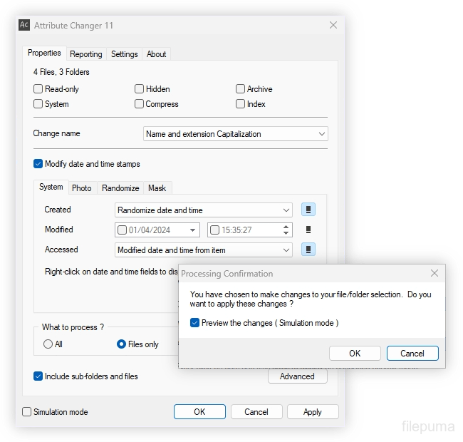 Attribute Changer provides advanced customization options, including timestamp modification and attribute inheritance settings. Users can set creation, modification, and access dates manually or synchronize them across files. Attribute Changer also integrates seamlessly with Windows Explorer, offering right-click menu access for instant attribute adjustments. This feature enhances workflow efficiency by eliminating the need for complex command-line operations.