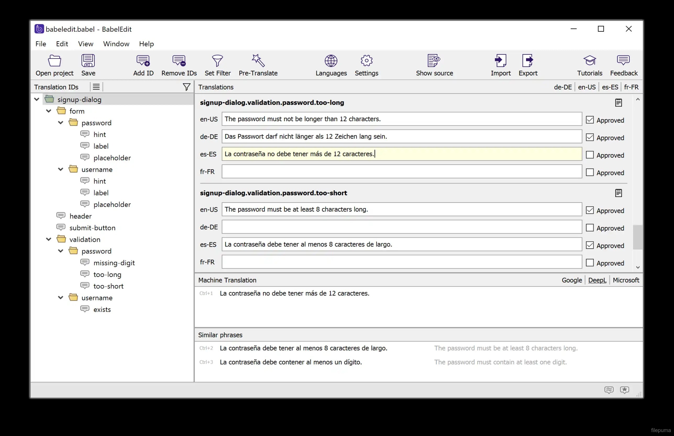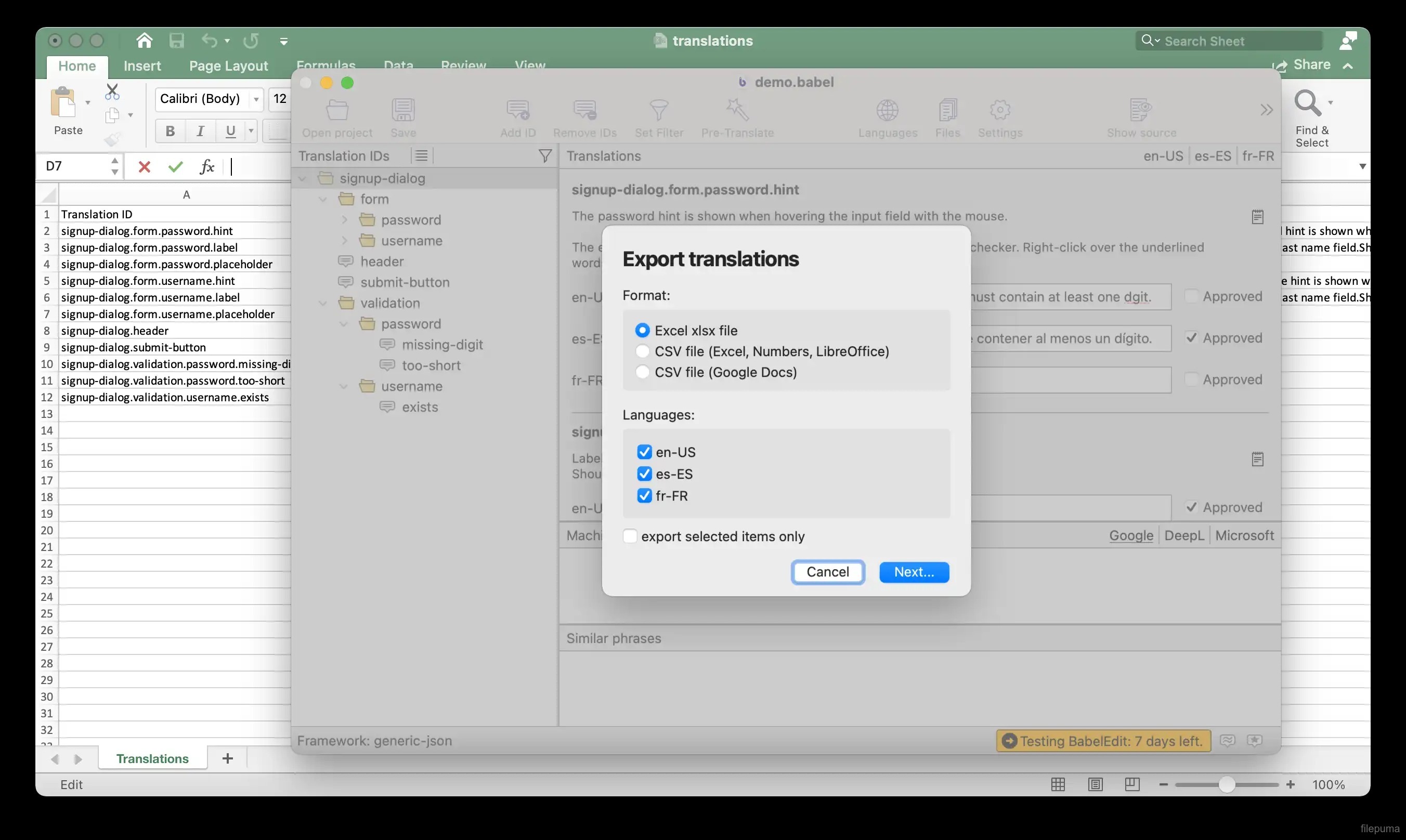 BabelEdit is a software designed to help developers manage translation files easily. It supports many popular file formats such as JSON, YAML, and PO, making it easier to handle multiple languages in projects. This simplifies the process of editing and maintaining translations without the need to open files separately.