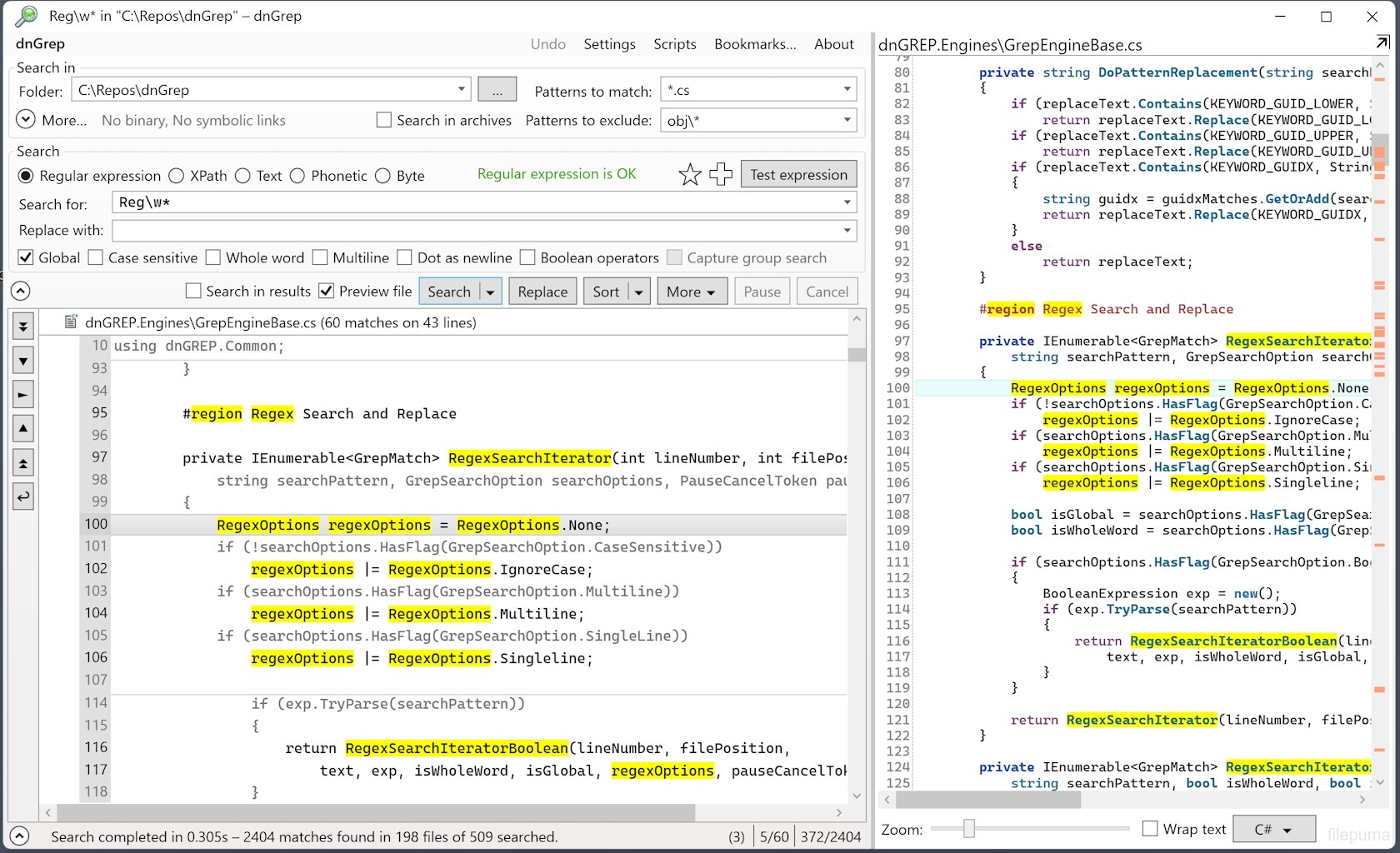 dnGrep is a search utility for Windows that helps users find text inside files and folders. It supports many file types, including plain text, code, and documents. With a clear interface, it allows quick navigation of results and highlights matches, making it easy to understand where content appears. It previews files directly within the window.