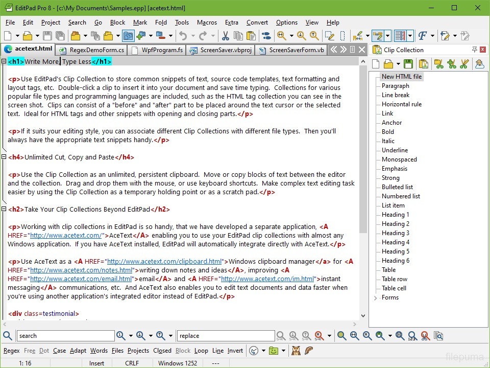 EditPad Pro also offers extensive file management options. Tabs make it simple to work on multiple documents simultaneously, and a tabbed clipboard keeps track of recent copies for easy reuse. It includes a robust backup system that prevents data loss and allows recovery of previous versions of files.