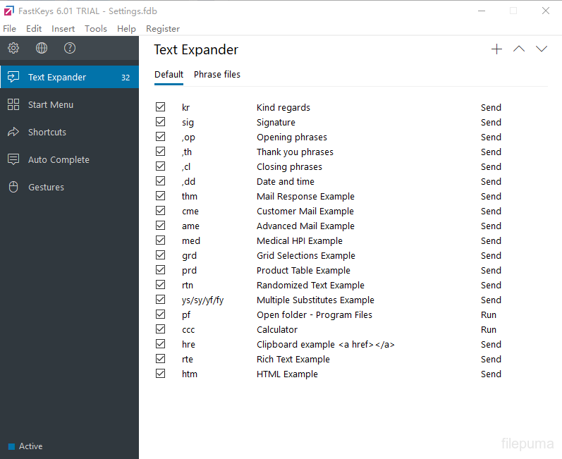 FastKeys features a robust text expansion tool that enables users to replace short abbreviations with full phrases, saving time when typing frequently used text. Additionally, it includes a start menu customization feature, allowing quick access to applications and files with minimal effort. FastKeys also supports mouse gestures, further improving navigation and task execution.