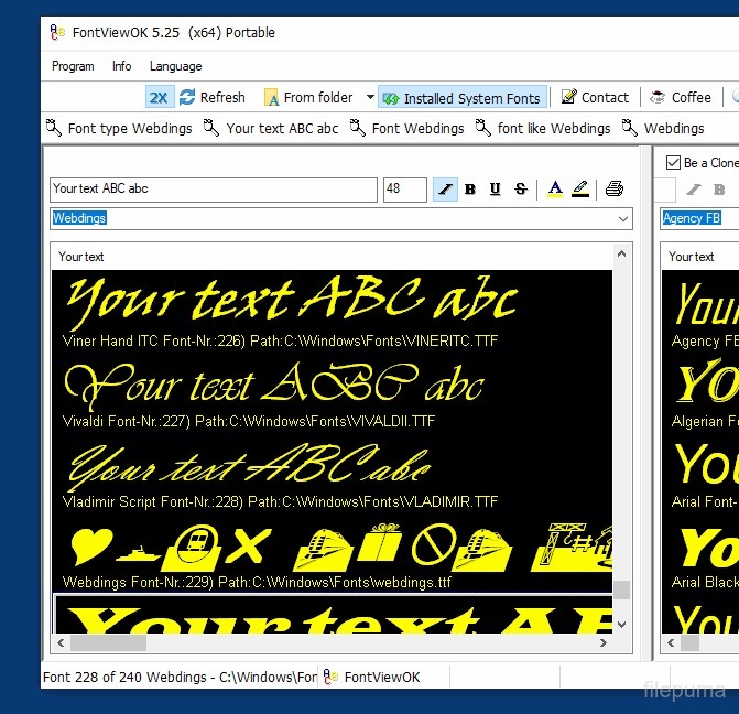 FontViewOK Portable is a small application designed for viewing and comparing fonts on your computer. It allows users to see all installed fonts in a clear and organized way. With this tool, you can easily check font styles and sizes without opening other applications.