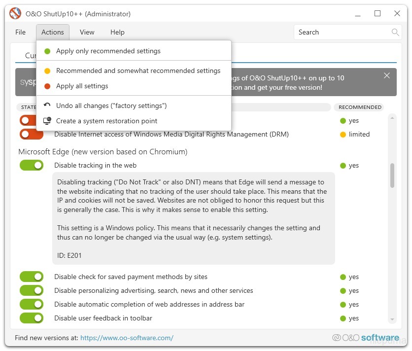 O&O ShutUp10++ also includes a "Recommended settings" feature, which provides users with safe and privacy-friendly settings without needing advanced technical knowledge. This ensures that even novice users can easily improve their privacy settings with minimal effort.