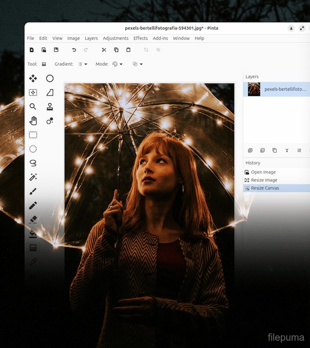 Pinta supports common file formats, including PNG, JPEG, and TIFF, allowing users to edit and save images without compatibility issues. Despite its simplicity, Pinta includes advanced functionalities like unlimited undo/redo, gradient fills, and plugin support for extended customization.