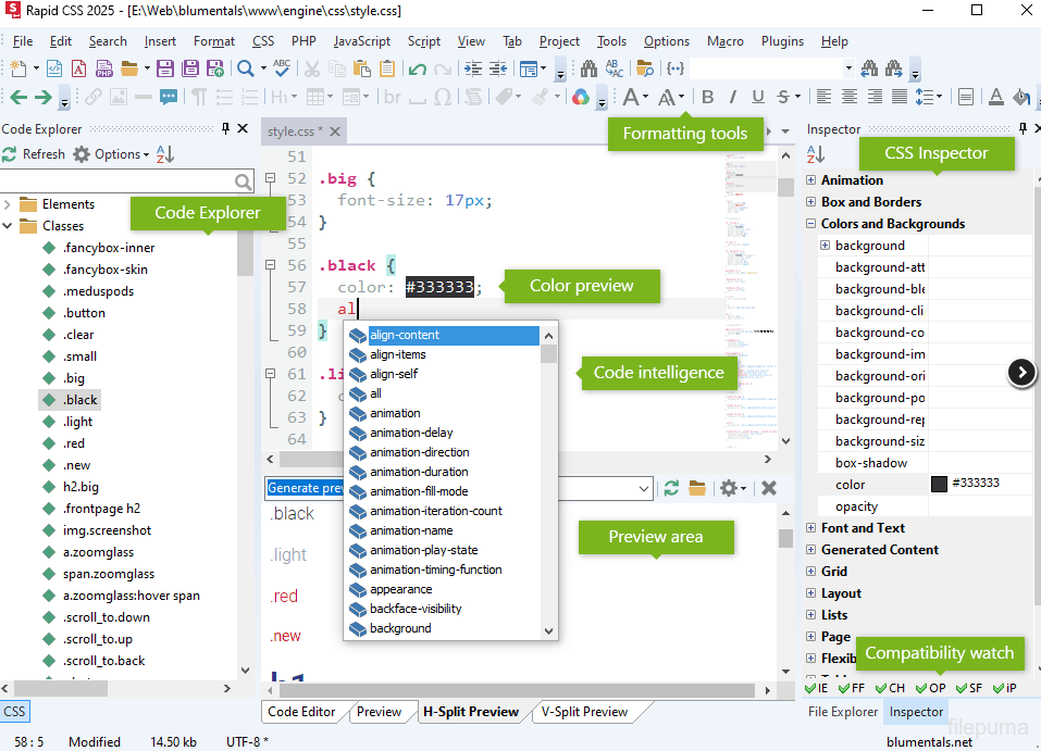 Rapid CSS Editor includes advanced search and replace functions, multi-caret editing, and code folding to boost productivity. External tools and scripts can be integrated, allowing developers to customize the editor to fit their specific needs. The program is compatible with modern standards and regularly updated to reflect new web technologies.