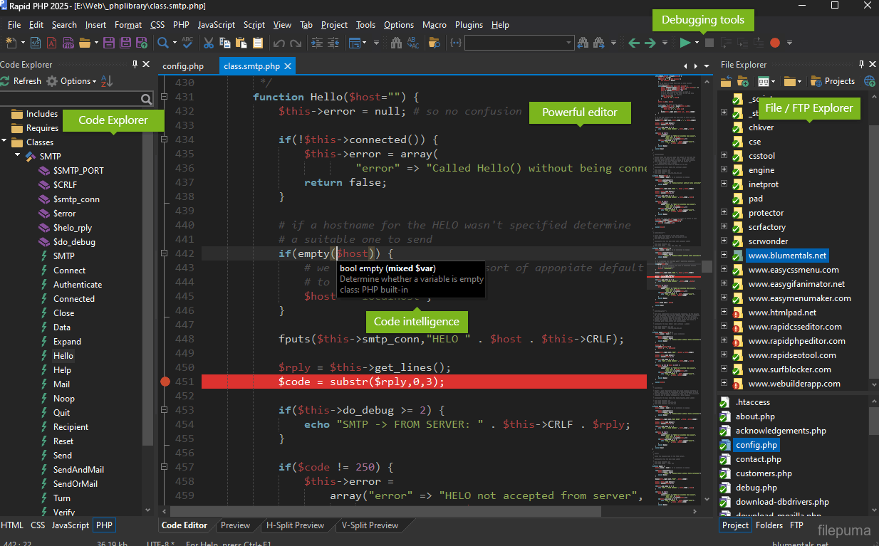 Rapid PHP Editor integrates useful web development tools, including a built-in FTP client for quick file transfers and live editing on remote servers. The software also provides database management features, enabling seamless interaction with MySQL and other databases. With customizable templates and snippets, developers can speed up coding and maintain consistency across projects.