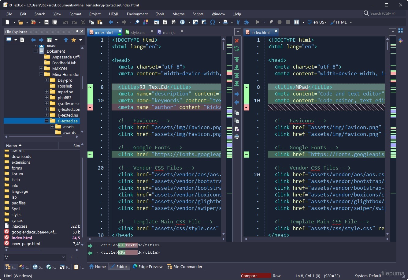 RJ TextEd also integrates powerful web development features. It supports HTML, CSS, JavaScript, and PHP editing, including live preview of web pages. Built-in spell checking, search and replace across files, and code validation tools make managing large projects easier. FTP and SFTP connectivity further simplify uploading and managing web content directly from the editor.