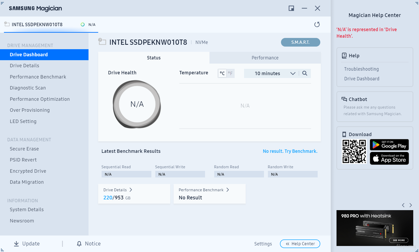 Samsung Magician supports performance benchmarks that help users measure the drive's read and write speeds. It also offers performance optimization features such as TRIM and Over Provisioning, helping to maintain drive efficiency over time. Secure Erase is available as well, allowing safe data removal when needed.