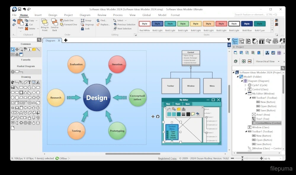 Software Ideas Modeler Portable supports numerous diagram types, including UML, flowcharts, mind maps, and business process diagrams. With these options, it caters to both technical and non-technical projects, enabling clear visualization of concepts, workflows, and system structures. Its interface is intuitive, providing straightforward access to design tools and customization options, which help streamline the modeling process.