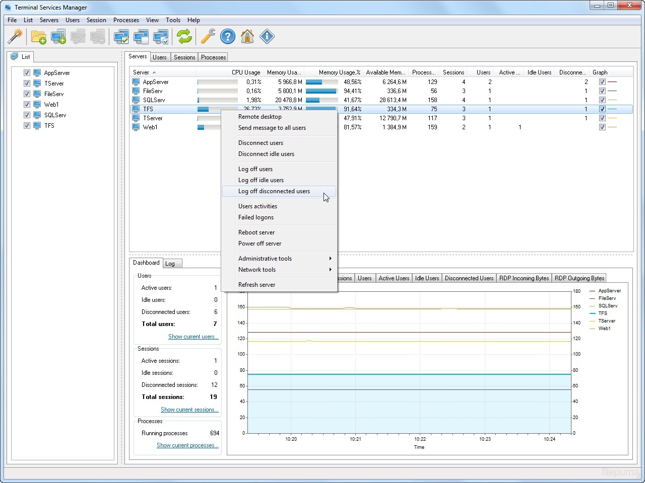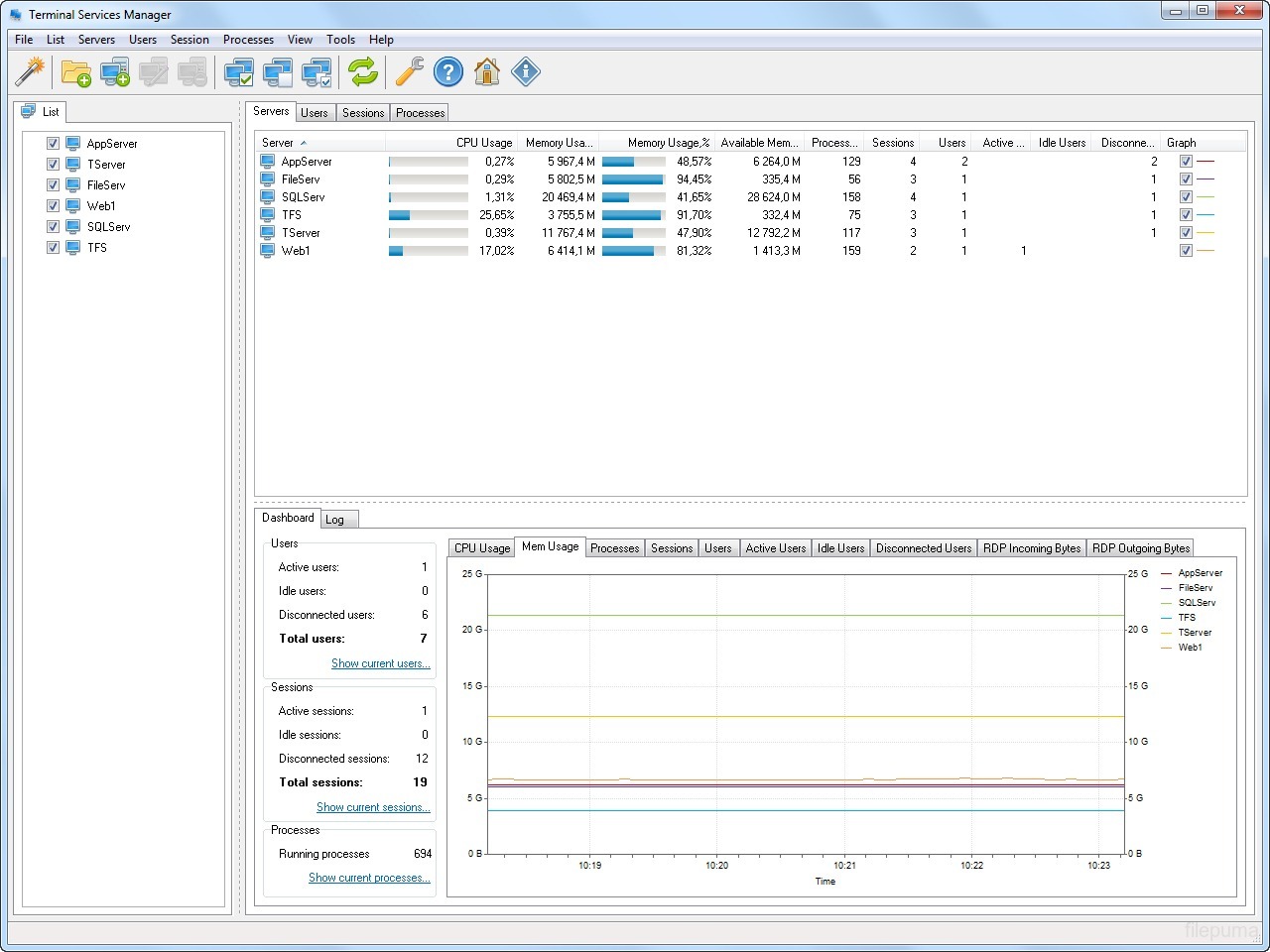 Terminal Services Manager is a Windows-based application designed to monitor and manage remote desktop sessions. It gives system administrators a clear view of all active, disconnected, and idle sessions on local or remote servers. With this tool, users can track performance, view detailed session information, and take control of user sessions when needed.