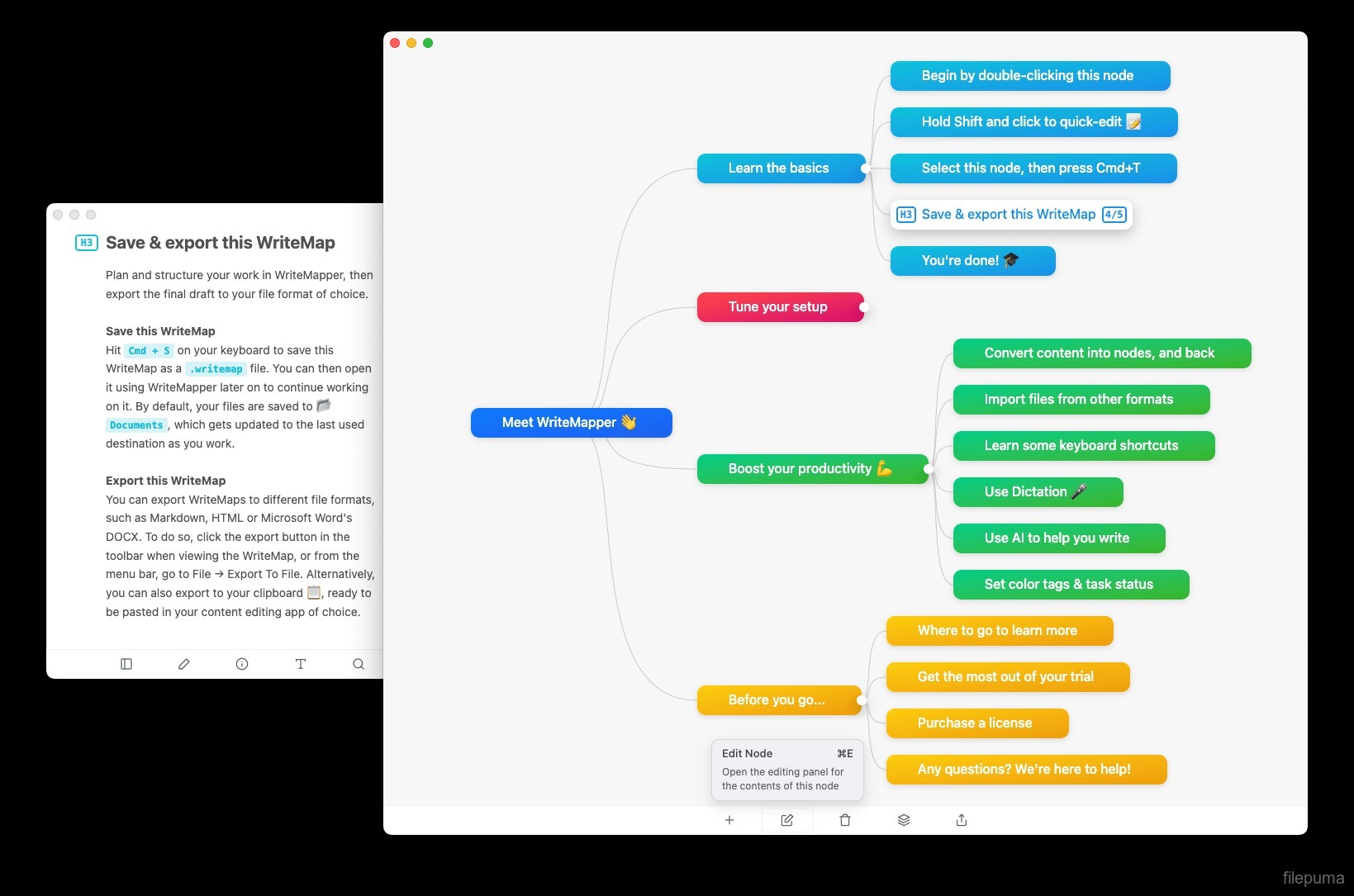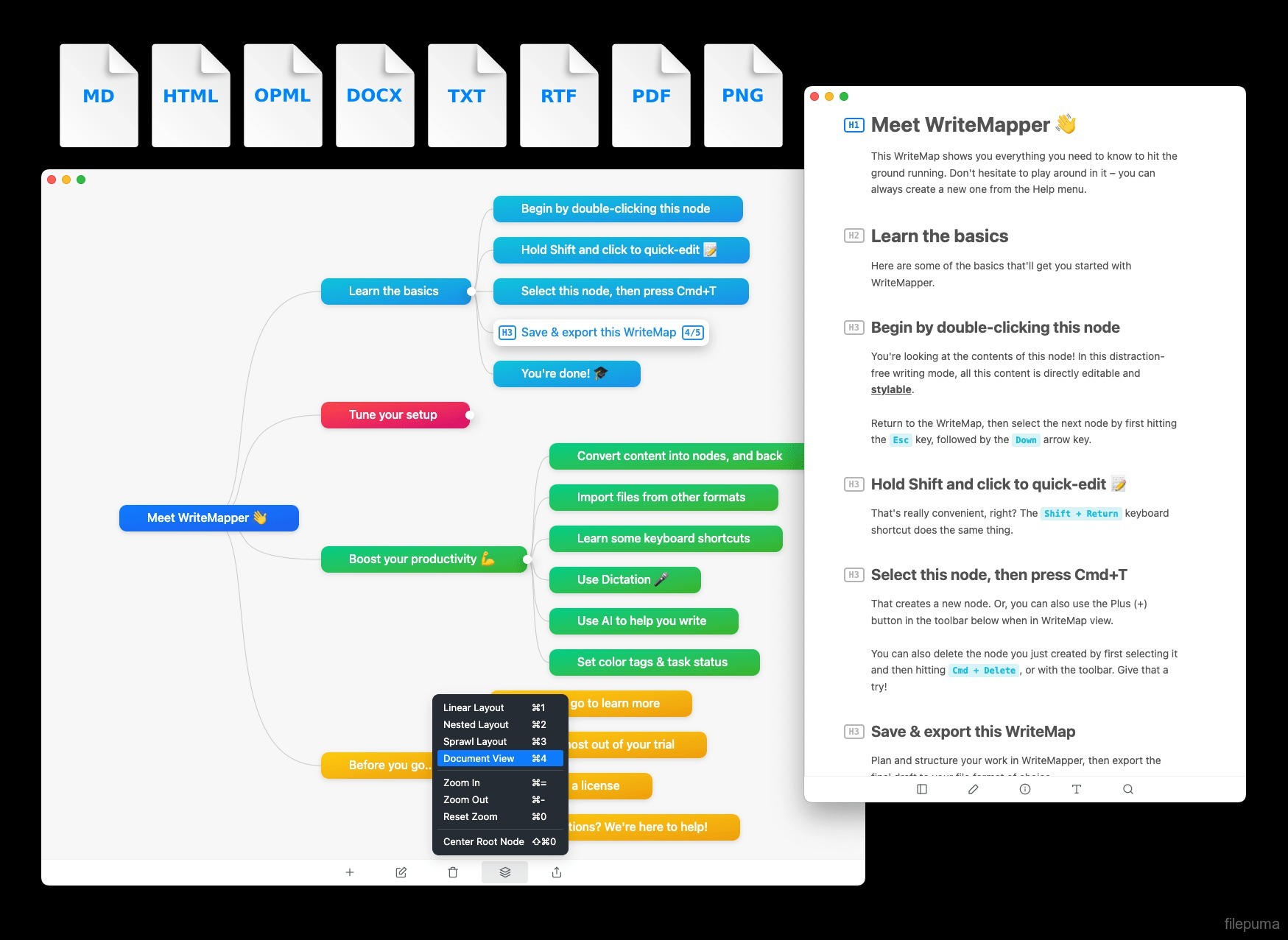 One of WriteMapper's key features is its seamless conversion of mind maps into structured documents. This means that writers can brainstorm and outline their work visually, then instantly transform these outlines into comprehensive drafts. The software supports various export formats, including Markdown, HTML, and Microsoft Word, making it adaptable for different writing needs.