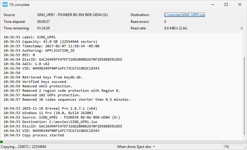 Xreveal operates quietly in the background and works on the fly without storing decrypted data to the hard drive unless the user chooses to back up content. Users can create ISO images or rip disc content into folders for archival or playback purposes. Xreveal also includes features such as verifying the integrity of Blu‑ray M2TS files and changing ISO volume labels, making it useful for managing digital copies of physical media.