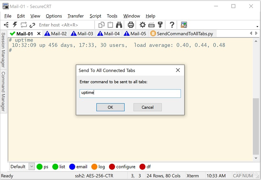 SecureCRTofrece una interfaz intuitiva que incluye sesiones con pestañas, barras de herramientas personalizables y soporte para una amplia gama de emulaciones de terminal como VT100, VT220 y ANSI. Los usuarios también pueden beneficiarse de características avanzadas como la agrupación de sesiones, el resaltado de palabras clave y un lenguaje de scripting incorporado, que automatiza tareas repetitivas y aumenta la eficiencia.
