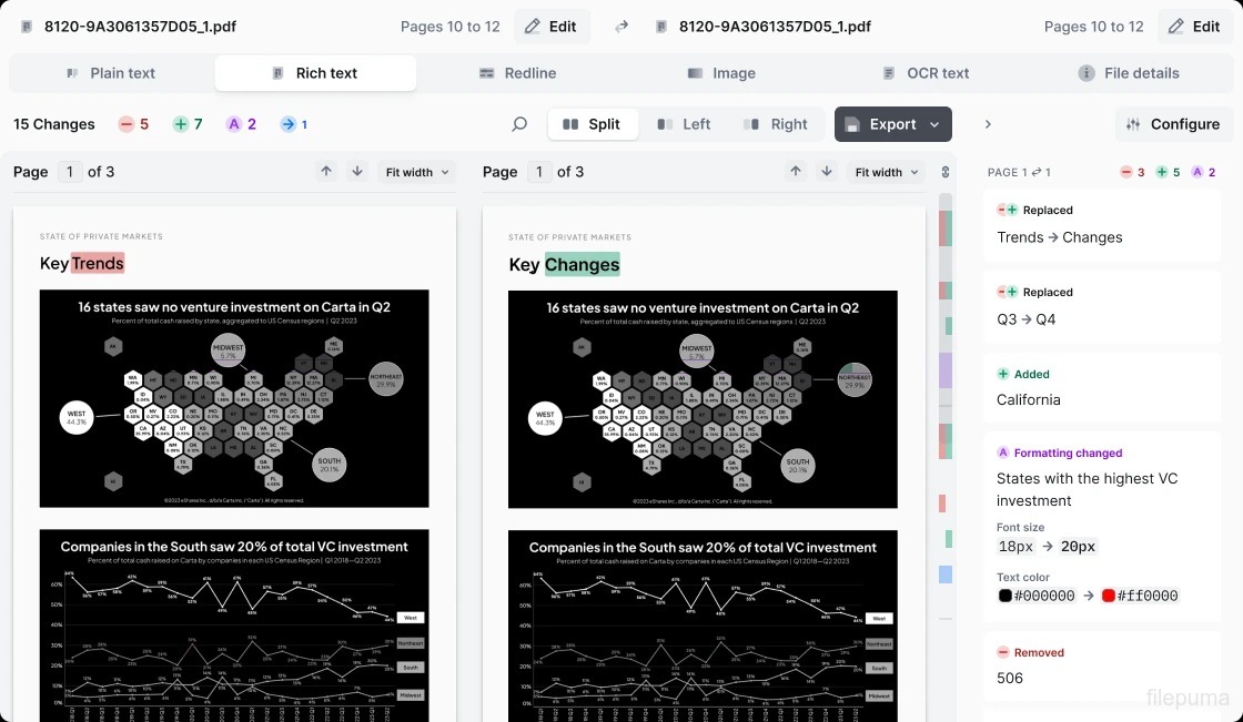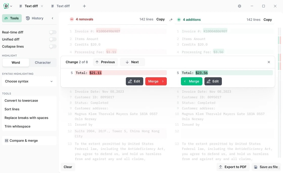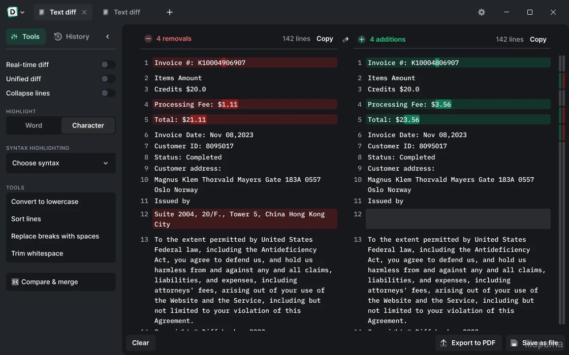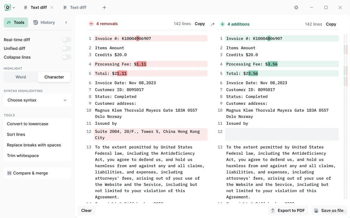 Diff Checkerprend en charge plusieurs types de fichiers, y compris le texte brut, les PDF, les feuilles de calcul et même les images. Les utilisateurs peuvent copier et coller du texte directement dans l’interface ou télécharger des fichiers pour les comparer. Les différences sont mises en évidence en couleur, ce qui permet de repérer facilement les ajouts, suppressions ou modifications d’un coup d’œil.