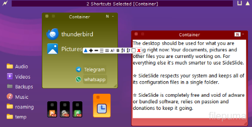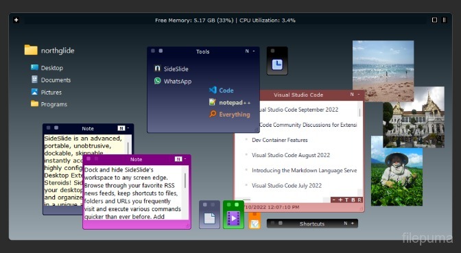 SideSlideest un organiseur de bureau qui aide les utilisateurs à gérer efficacement les fichiers, dossiers et applications. Il offre une barre latérale personnalisable qui peut contenir des raccourcis, des notes et des widgets, permettant un accès rapide aux éléments importants sans encombrer le bureau. Les utilisateurs peuvent organiser leur espace de travail selon leurs préférences, améliorant ainsi la productivité et le flux de travail.
