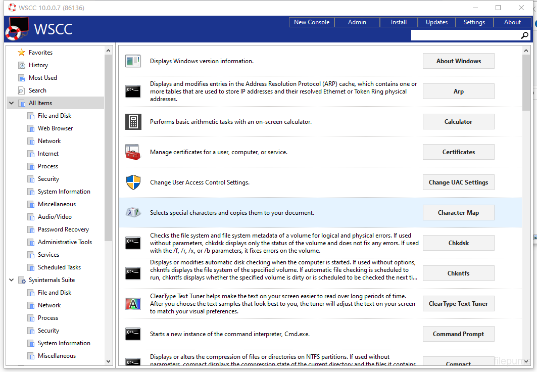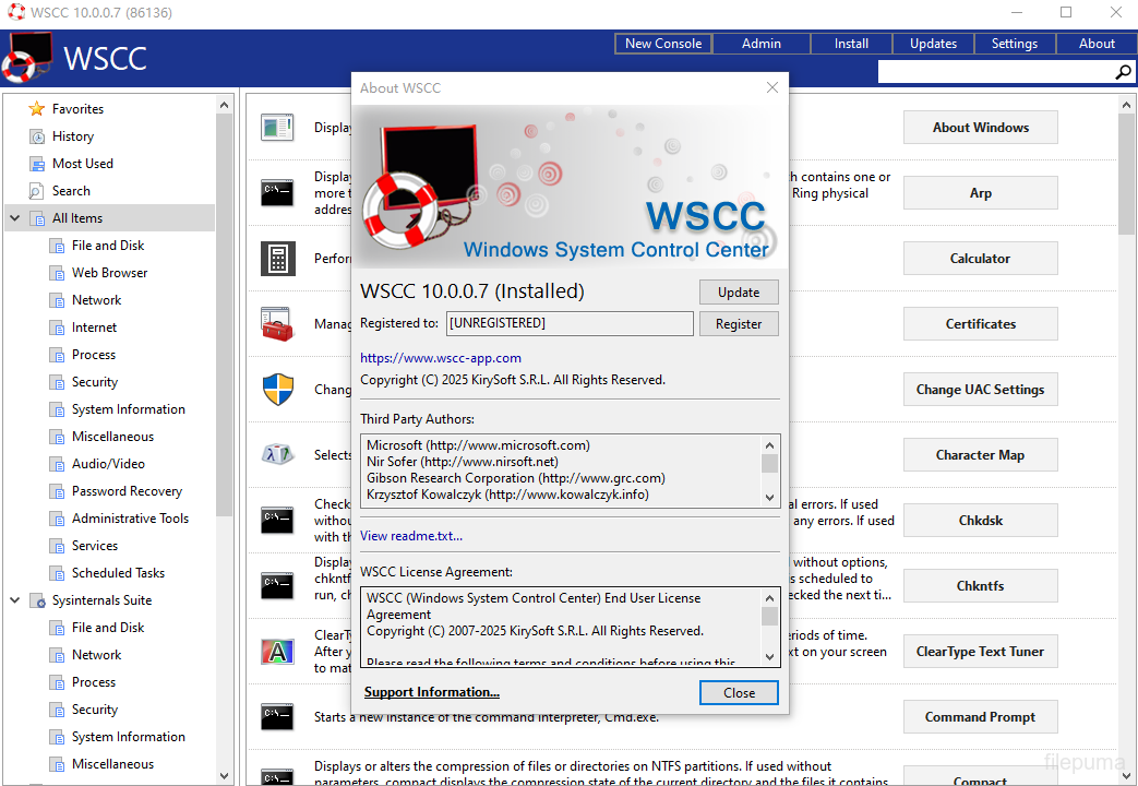 WSCC-Windows System Control Centeradalah utilitas yang memungkinkan pengguna mengelola, menginstal, dan memperbarui alat sistem Windows dari antarmuka terpadu. Ini mendukung suite terkenal seperti Sysinternals Suite dan NirSoft utilities, memberikan akses yang nyaman ke puluhan alat pemecahan masalah dan administrasi.
