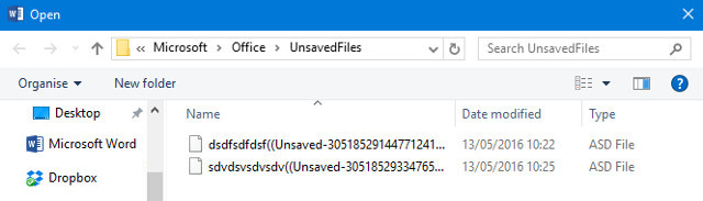 You’ll be presented with a window displaying Office’s UnsavedFiles folder. Any documents that the software managed to recover will be present as ASD files — automatic backups used by the Office suite. As you can see, they’re unlabelled, so you’ll have to use the date they were last modified or trial and error to determine whether or not your document was rescued.