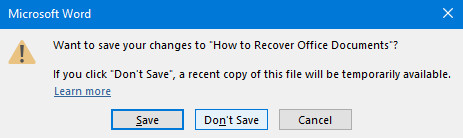 As you can see above, I’ve foolishly clicked Don’t Save while exiting Microsoft Word, and I’ve lost a considerable amount of work on my document as a result. Fortunately, the application will temporarily hold a copy of the file in case of this occurrence.