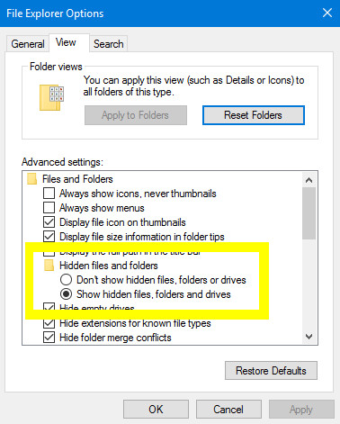 Type File Explorer Options into the search bar and open the corresponding Control Panel result. Switch to the View tab and find the Hidden files and folders radio toggle in the Advanced settings section.