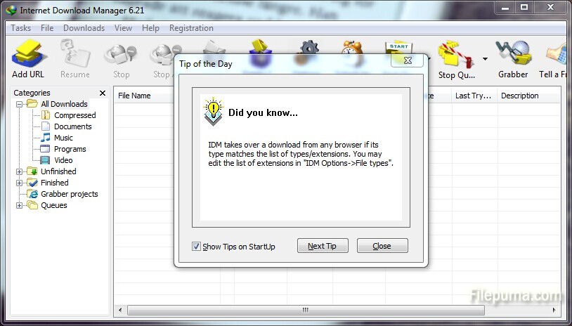 2. Run Internet Download Manager and you can see the programs, it will also give you the tip of the day to allow you to use it better.