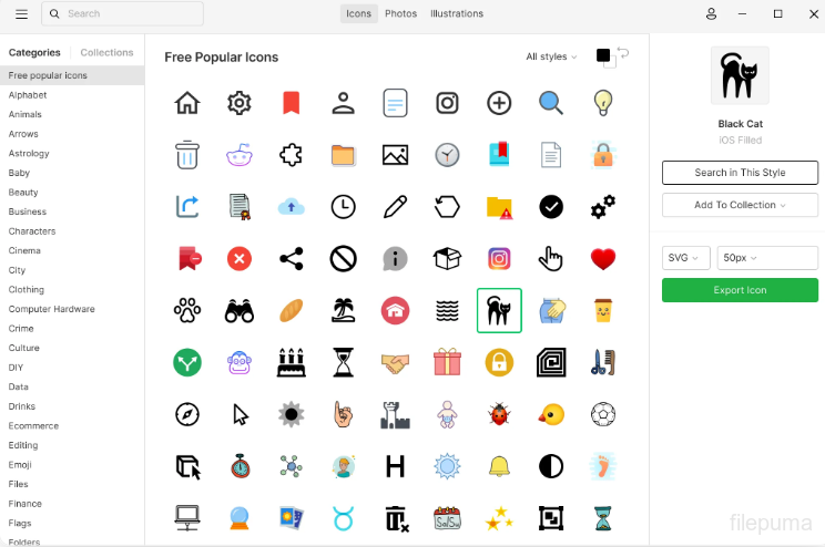 介面乾淨直觀,使用者可以搜尋、瀏覽,並將圖示拖放到他們的專案中。Pichon支援常見格式,如PNG和SVG,並提供靈活的圖示尺寸與顏色自訂選項。這種適應性使其適用於各種設計任務和平台。
